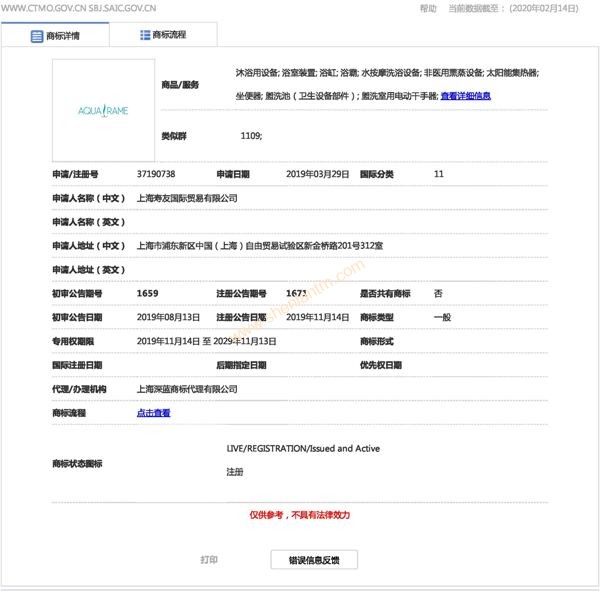 商標注冊證核定使用商品:沐浴用設備; 浴室裝置; 浴缸; 浴霸; 水按摩洗浴設備; 非醫(yī)用熏蒸設備; 太陽能集熱器; 坐便器; 盥洗池(衛(wèi)生設備部件); 盥洗室用電動干手器。